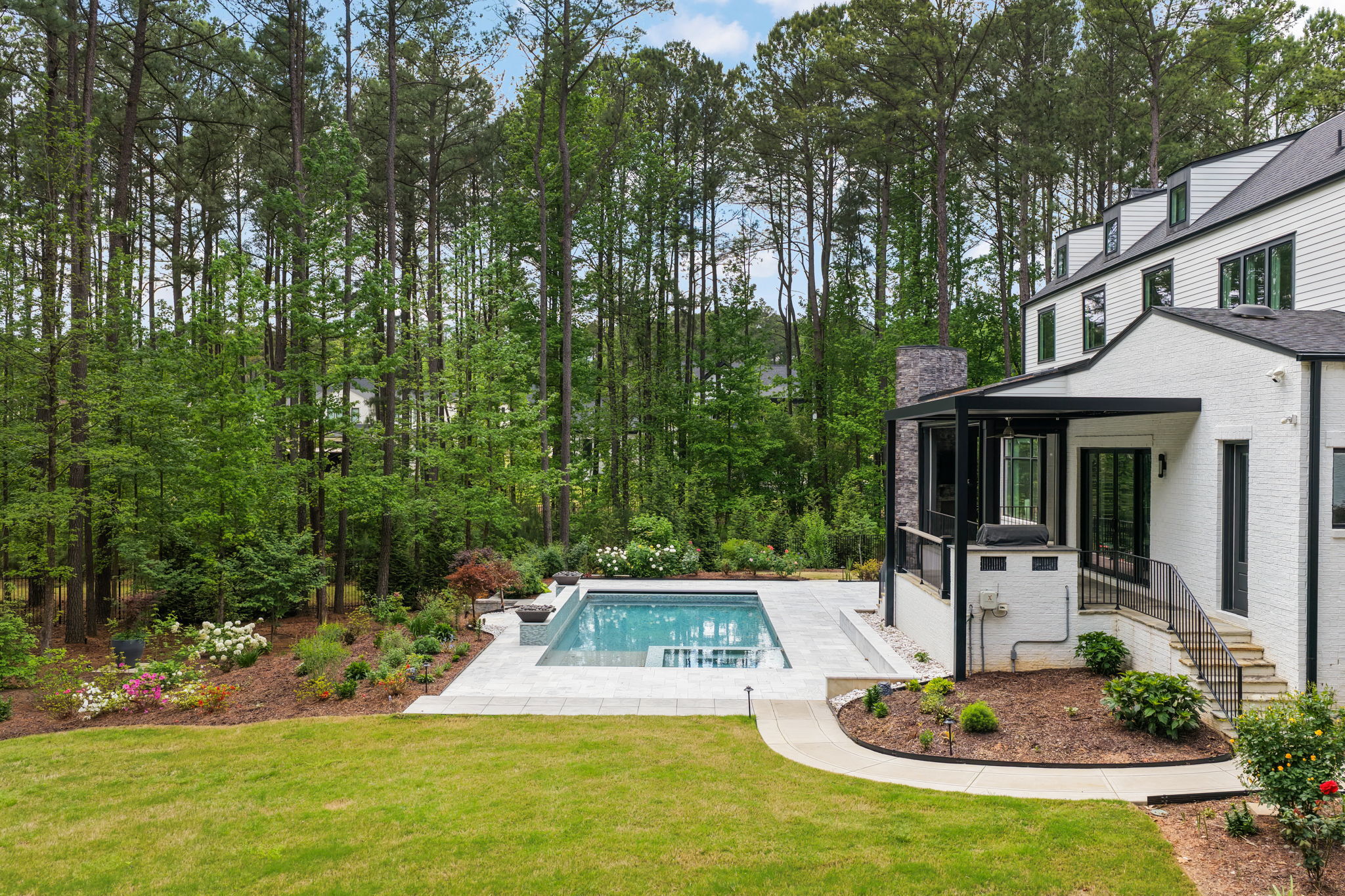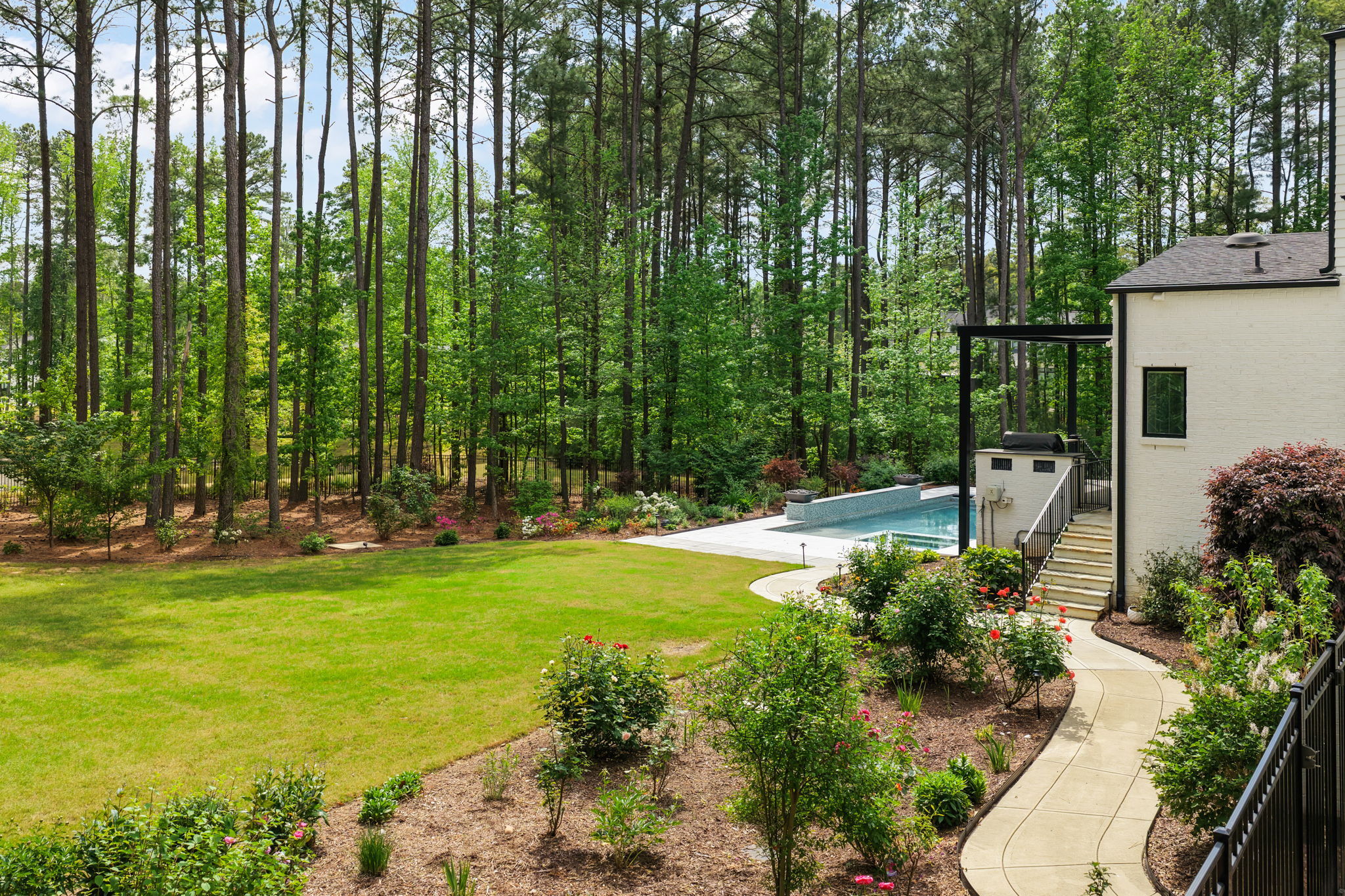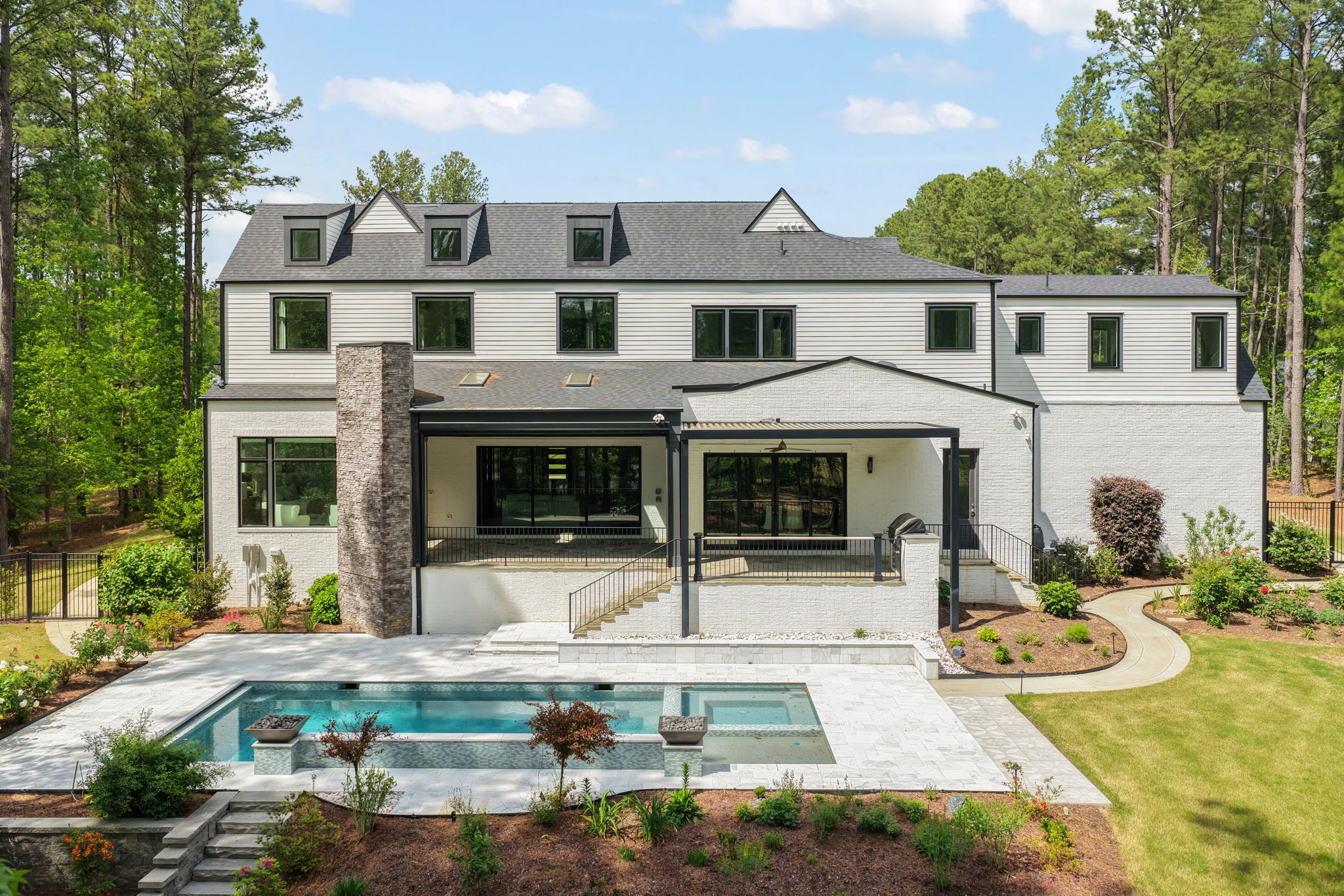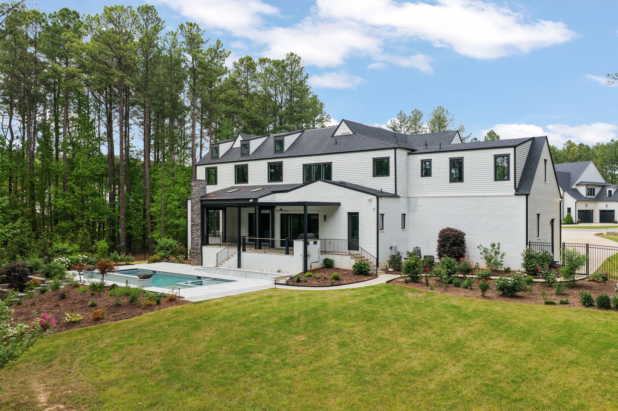 Set on 1.3 private acres in Avalaire, one of Raleigh’s most prestigious luxury communities, this 7,643-square-foot custom estate offers an exceptional blend of privacy, architectural sophistication, and premier location near RTP, downtown Raleigh, and RDU. Designed for both grand entertaining and everyday living, the home features four ensuite bedrooms and lives like five or six with two primary suites—one on the main level and one upstairs—plus multiple flex spaces for offices, media, or guest rooms. Retractable glass doors open the family room to a bluestone porch and an extraordinary outdoor living experience, anchored by a heated saltwater gunite pool with spa, fire and water features, and retractable cover, alongside a raised outdoor entertaining area with built-in grill and automated pergola. A private elevator, expansive bonus room with wet bar, five-car garage, circular drive, and meticulously landscaped grounds complete this rare estate, delivering luxury, lifestyle, and unforgettable entertaining in one of the Triangle’s most coveted neighborhoods.